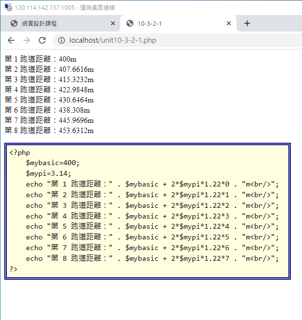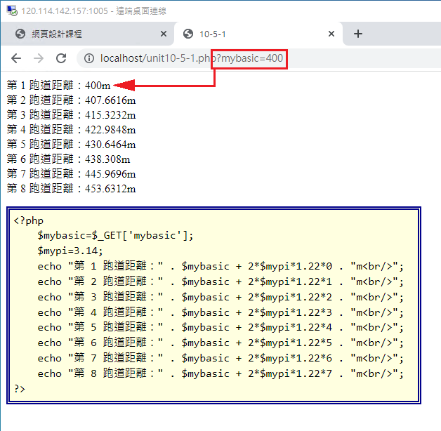 那個 $phpvar 是 PHP 裡面再設定一個變數名稱。我們同樣以賽道資訊來說明一下,假設操場的賽道標準長度為 400, 300, 200 這三種, 我想要透過設定一個 mybaic 變數,且透過網址列直接傳輸時,就得要透過上述的 $_GET['mybasic'] 來將變數內容抓下來才行。
