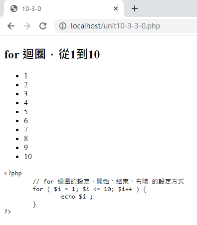 直接帶入 PHP 網頁時,就會輸出 1 ~ 10 的數字。我們來使用網頁安全色,那就是: