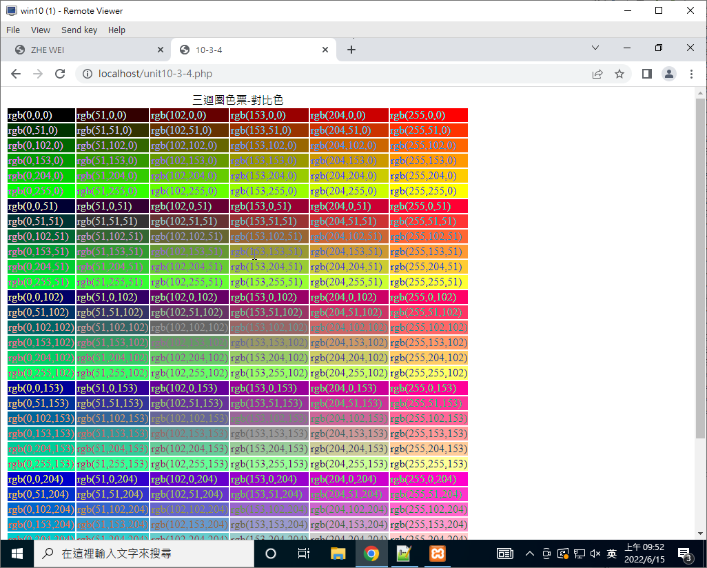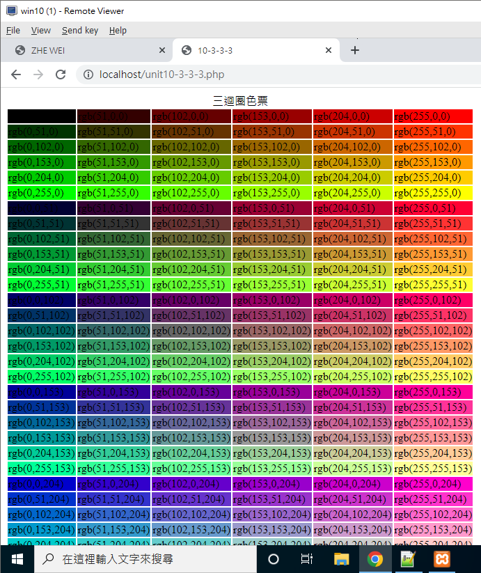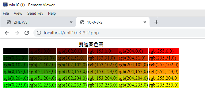 上面的作法當中,框框內的文字最好使用對比色來處理,不然黑壓壓一片,某些顏色就看不到文字了!那對比色怎麼處理呢?其實對比色就是 R, G, B 的顏色, 都用 255 去減,就會得到對比色。例如 rgb(0,0,255) 的對比色就會是 rgb(255,255,0)。同樣的,讓我們使用上述的檔案來重新建立一個新的具有對比色文字的表格。