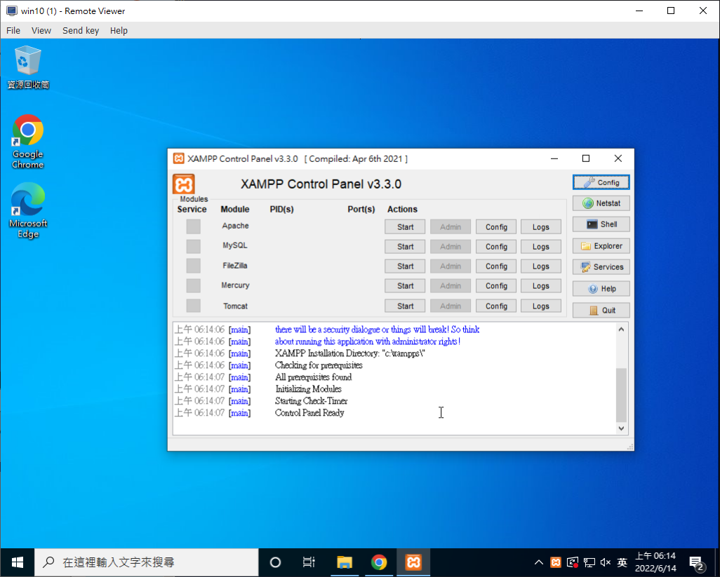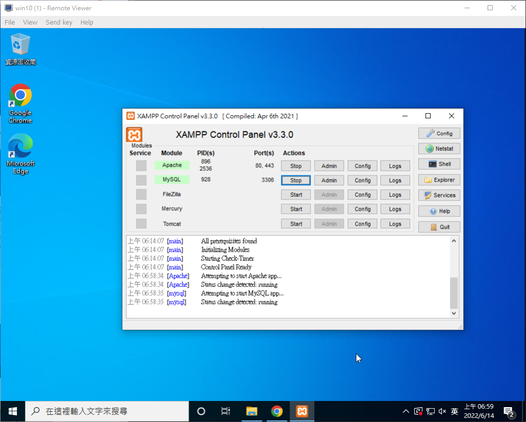 將"Apache"和"MySQL"的Start按下去啟用