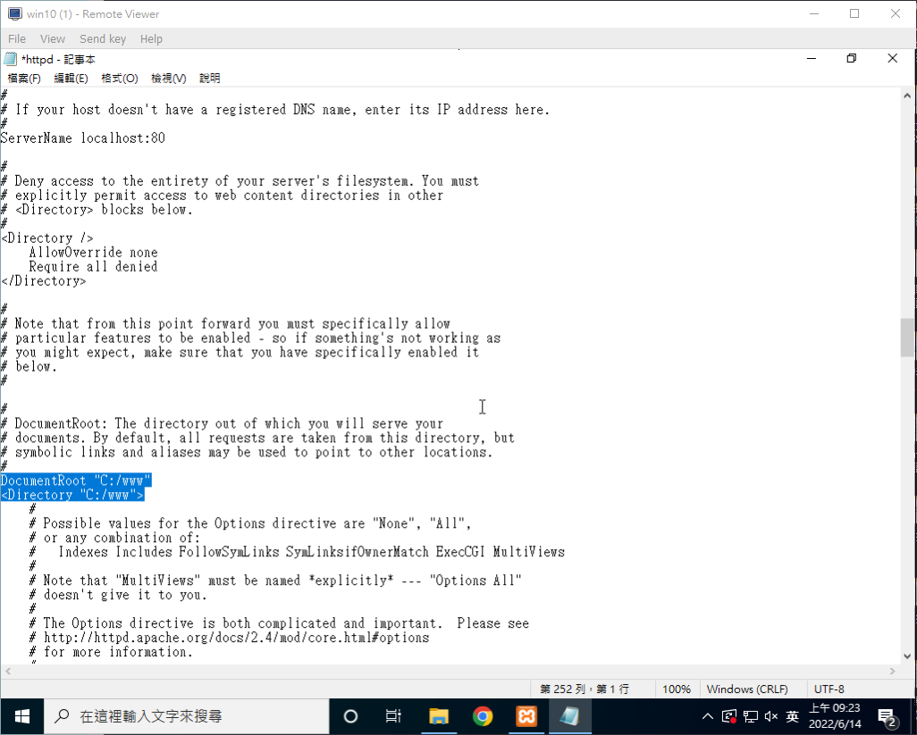 我想要將網頁預設路徑放在C槽底下的www的資料夾裡,那我就把這兩行的C:/xampp/htdocs 改成C:/www 。