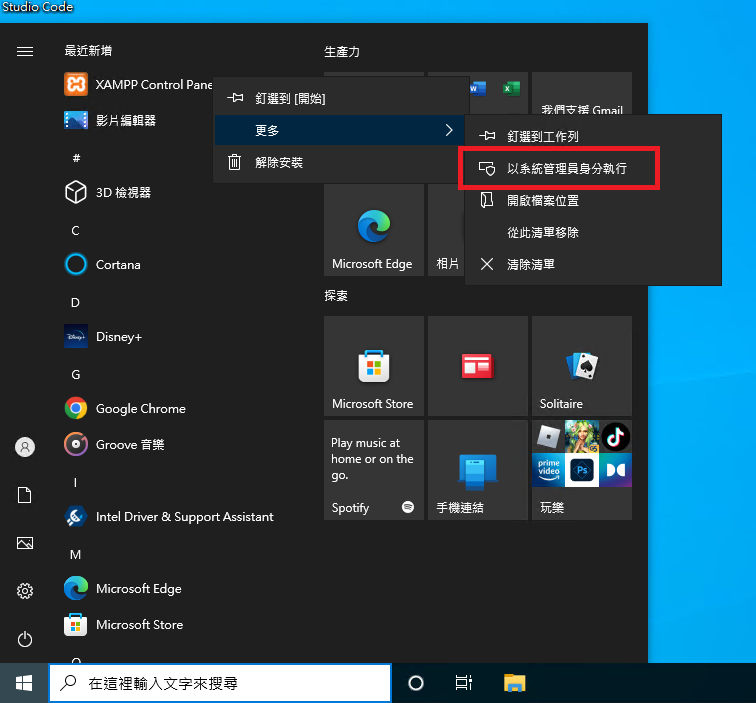 如果直接用左鍵點開XAMPP系統只會以一般使用者的身分打開XAMPP,這樣會無法設定自動啟動,所以我們要用管理員的身分打開XAMMPP才能設定開機自動啟用。