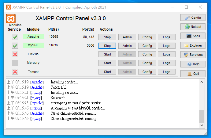 當我們的電腦重新開機時會將一些服務關閉,每次只要重新啟動電腦時都要在自己手動將服務在開起來其實有點麻煩,所以我們將XAMPP裡的Apache和Mysql設定成自動啟動,只要當電腦重新啟動時XAMPP會自動將Apache和Mysql自動開起來,這樣就可以不用手動開啟了。