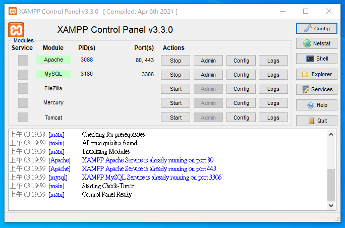 然後到XAMPP的控制台,將Apache和MySQL重新啟動