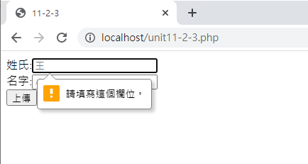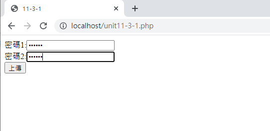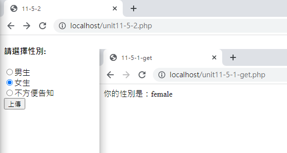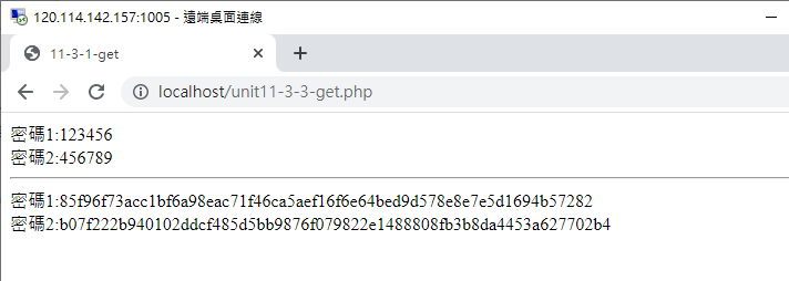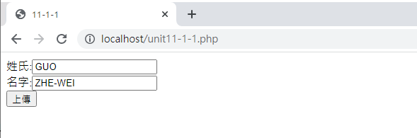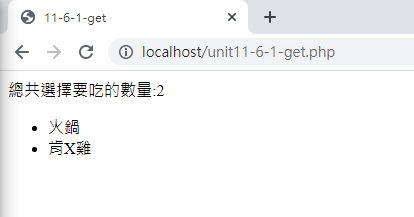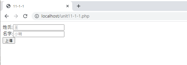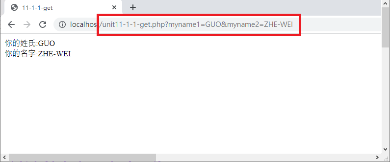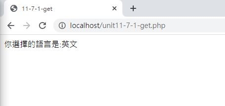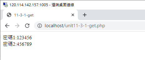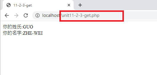 注意看,檔名會變成unit11-1-1-get.php,而且後面會加上變數的設定在網址列上面,這就是GET的傳輸方式。通常沒有重要資料的畫面才能使用GET方式,否則許多資料會出現在網址列上面,這是不安全的
