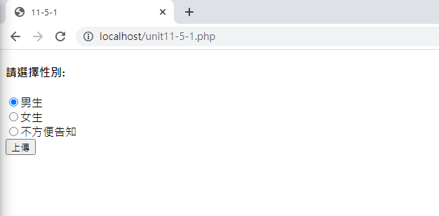 有的時候,我們會需要使用者填寫單選項的資料,例如性別的選擇等等。但是因為就只有幾個選項而已,因此不太想讓使用者輸入, 而是希望類似選擇題,讓使用者直接點選即可。這時就用到單選功能的項目了: