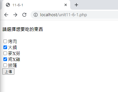 一般來說,複選會使用到『陣列』的機制,陣列在 HTML 裡面必需要加上中括號[]才行!不過 PHP 裡面倒是不需要加上中括號。 現在,讓我們來選擇一下,你可能會有興趣的餐點項目:
