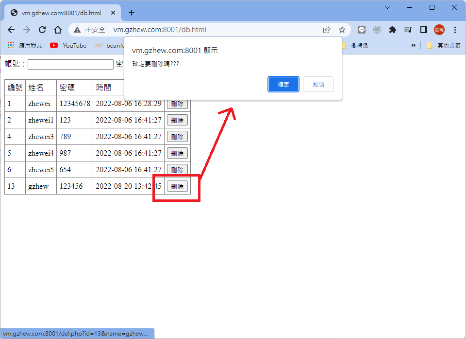 刪除的方式跟上面資料上傳不一樣,資料上傳需要透過輸入框填寫我們要上傳的資料,刪除則是只要透過按鈕按下後就會進行動作,所以當我們按下刪除按鈕後會同時把要刪除的資料一起傳到php檔做動作。