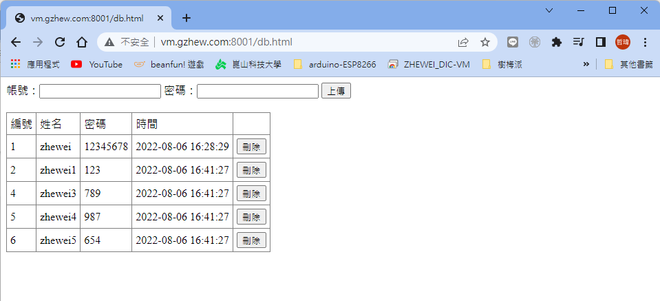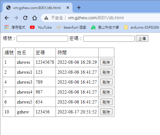 刪除資料的做法跟上面的上傳資料是一樣的做法,把SQL的指令改成delete就好,但要注意的是,刪除資料要把被刪除的那筆資料寫清楚,否則有可能會刪錯或多刪除資料,要特別注意喔。