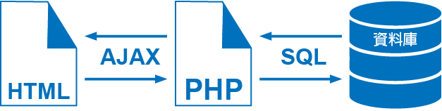 我們用php來製作與資料庫連線用的檔案,透過php連線去取得或寫入資料庫內的資料。之後再用ajax從php那邊將資料抓到html網頁。