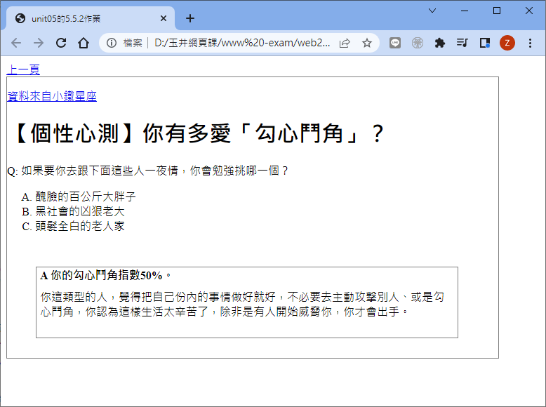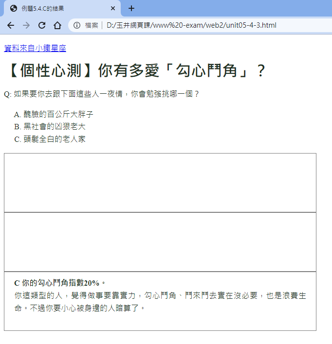 你可以透過 :hover 滑鼠特效,搭配 visibility 先將答案隱藏後,就可以讓使用者在不同的畫面中查看答案了! 其實上面的設計可能還沒有完整符合你的需求,讀者們可以發揮自己的創意,修改成各式各樣的展示喔!包括滑鼠指到 A, B, C 上面才顯示答案, 而不是移動滑鼠到下方的方塊上!
