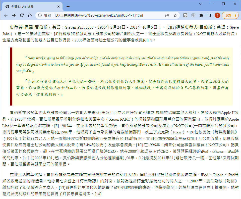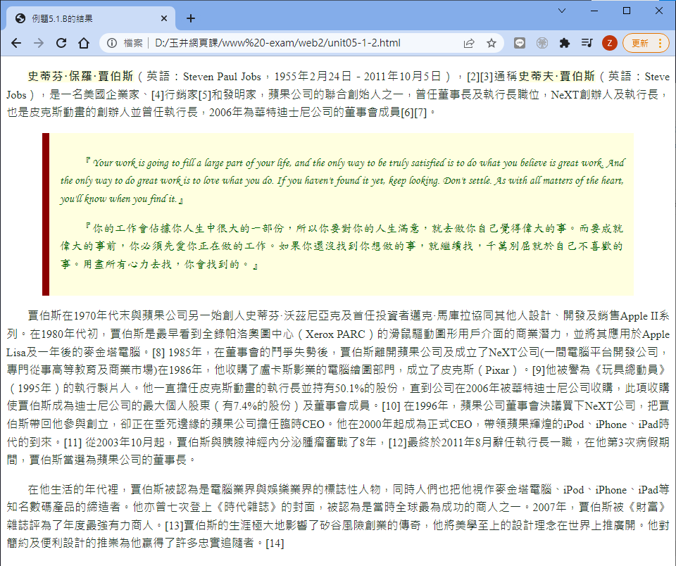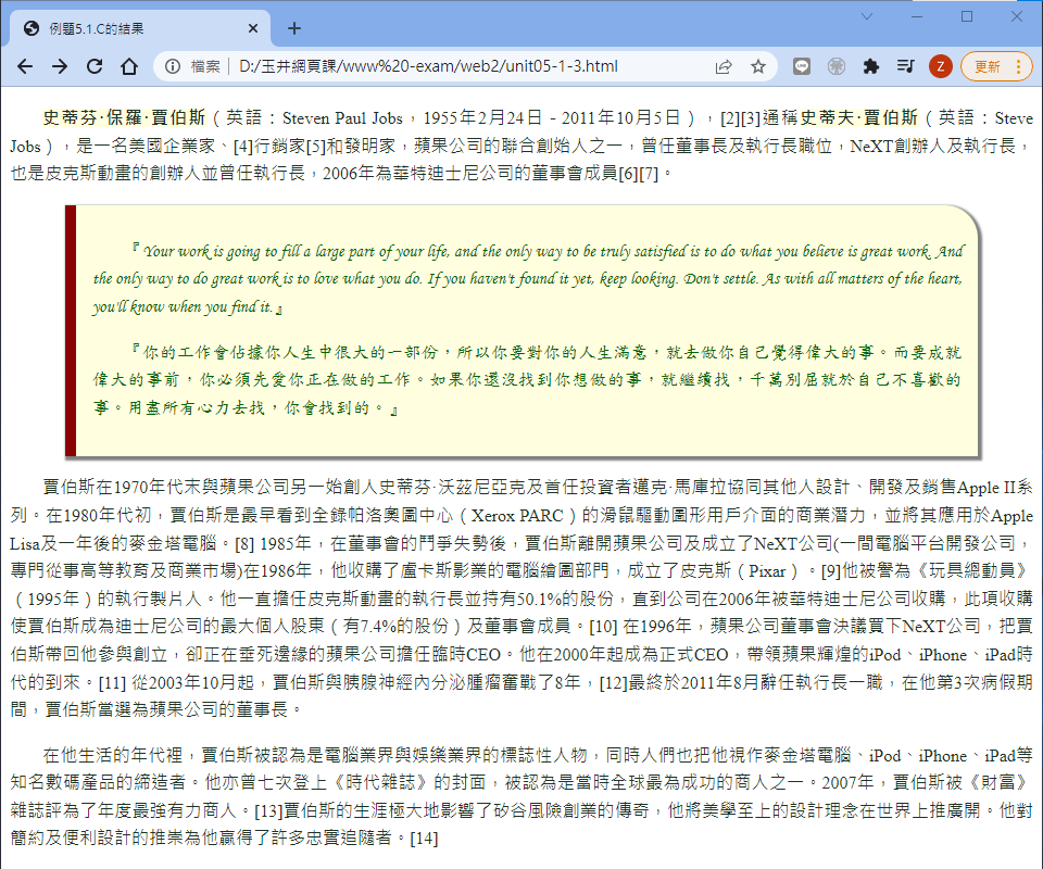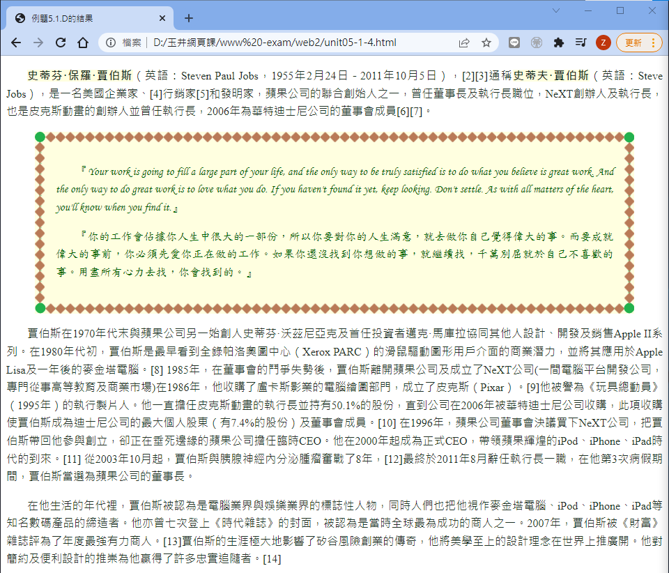 例題 5.1.A 提到的是方塊左側留白,那如果整體寬度佔用 85% 的寬度,然後要讓這個方塊置中呢?其實針對『區塊標記(一定要是區塊標記才會生效)』的 margin 設計中, 你可以讓左、右兩邊 margin 自動平均分配 (auto) 即可讓方塊置中了!不要使用 <center> 喔!