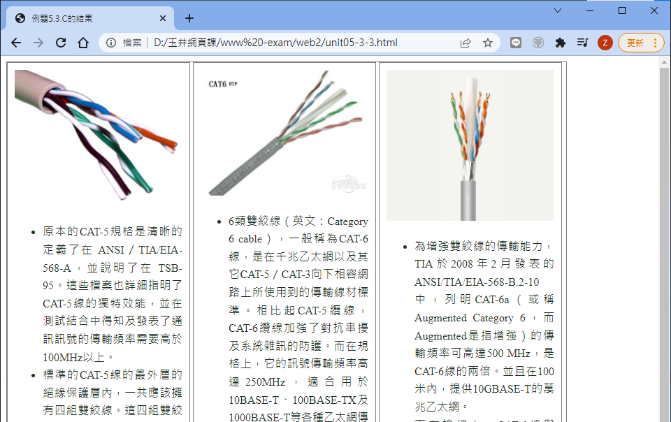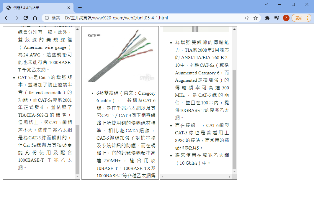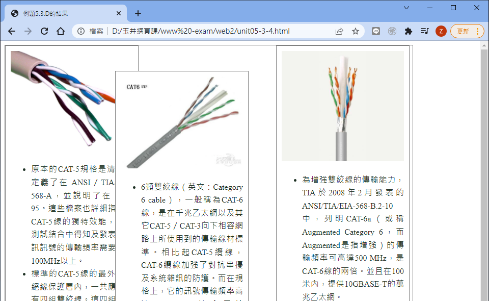 上面這個範例中,最後雖然可以讓方塊合在同一個水平線上,但因為方塊寬度使用的是百分比單位,所以當你拉動瀏覽器視窗時, 可能會出現照片超出框線的問題~另外,預設的方塊對齊方式,是靠近底部對齊,而不是靠近上方對齊, 所以就會出現畫面中的狀態。那為啥底部的線段沒有對齊呢?這是因為圖片裡面最終並沒有使用 p ,因此沒有一行的留白, 而文字裡面使用 p ,因此就會有一行的留白,就導致感覺上底部沒有對齊的假象。