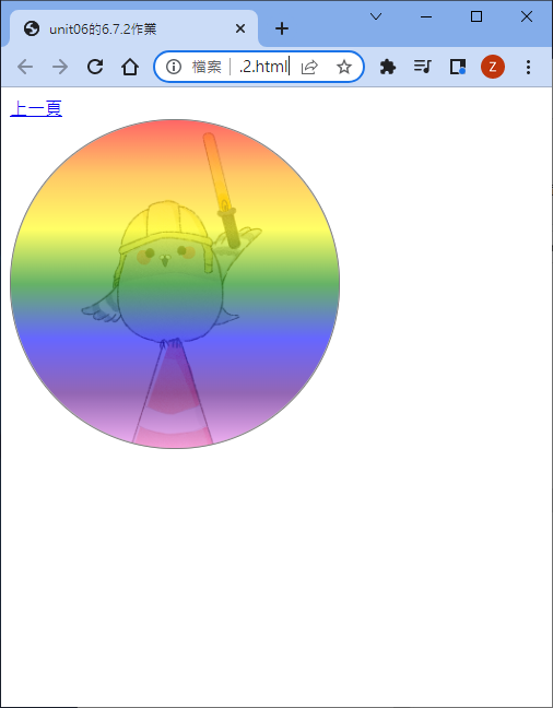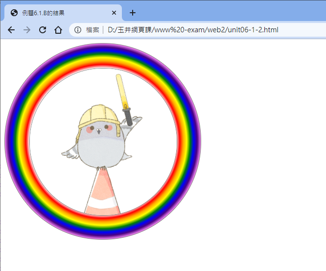 想一想,能不能將前一章節裡面談到的圓形大頭照外圍再多一個彩虹漸層色呢?其實好像也不難,就是兩個方塊,內層方塊就是大頭照,外層方塊做個彩虹的輻射漸層,只是需要規定幾個項目: (1)最內層的顏色會被大頭照覆蓋,所以要有 8 種顏色,外面七種才是彩虹色;(2)最內層的顏色應該要佔用很大的部份,因為那個部份會被照片所覆蓋的緣故;(3)預設的輻射漸層為對四個角做放射狀,但是我們是圓形,所以需要以四個邊來做漸層才對; (4)最好內部方塊位置可以是絕對值,這樣位置調整比較有可預測性。