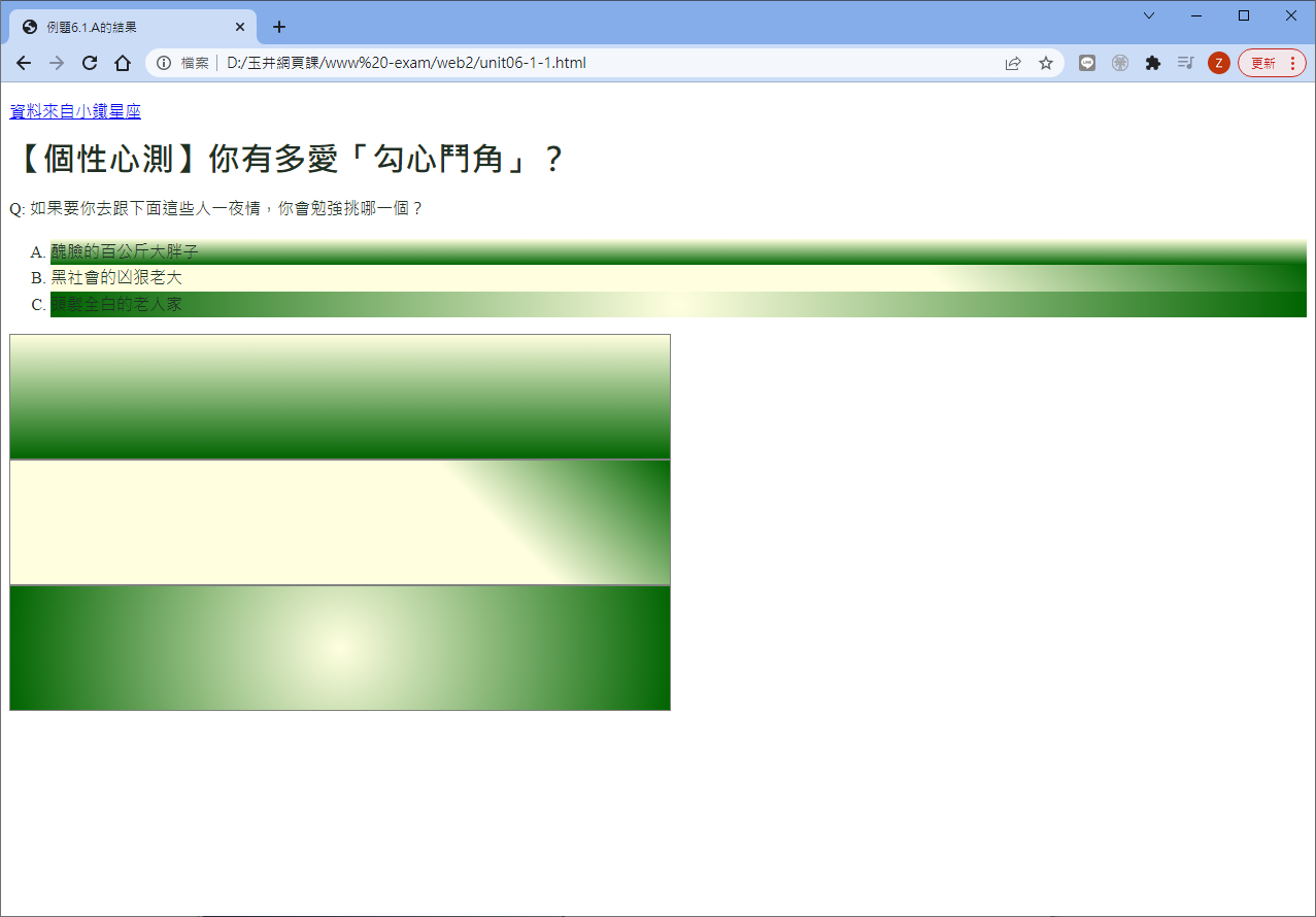 所以,如果你需要背景圖示,那就不要使用漸層,如果用了漸層,就不要想同時擁有背景圖喔! 這個小節會講漸層的使用,關於背景圖示的許多應用,就等下個小節來介紹囉!至於漸層的展示方法主要有兩種,分別是:
