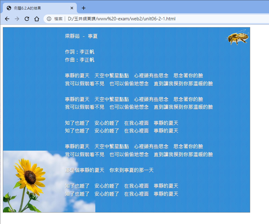 完成圖示之後,你可以嘗試將 page 這個外層方塊的寬度 (width:1200) 放大看看,你會發現蜜蜂與向日葵的距離被拉長了, 不過向日葵永遠在左下角,蜜蜂永遠在右上角,中間的方塊部份要規劃多大,就可以隨你開心來設計與填充所需要的文字、資料方塊了。