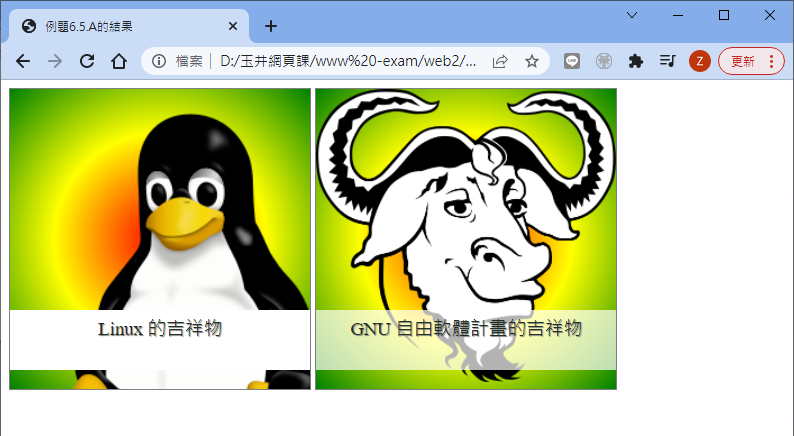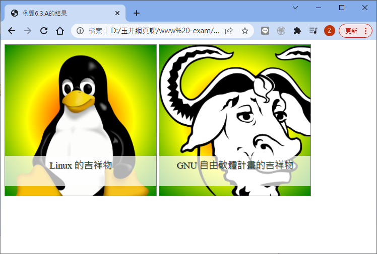 那該如何設計出類似如此的畫面呢?其實也不難,你只要 (1)設計出一個方塊 (2)將圖片與文字寫入方塊內 (3)讓圖示使用類似 width:100% 或 height:100% 之類的方式填滿 (4)最終讓文字緊黏在方塊最下方,並且給予適當的透明度,這樣應該就能夠達成需求了! 如果有需要特效,那是後面章節再來談到的,這裡先來玩一玩基本圖示即可。
