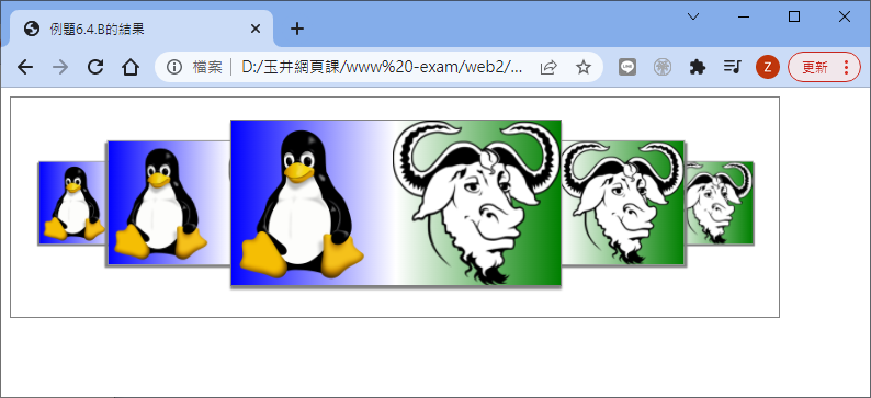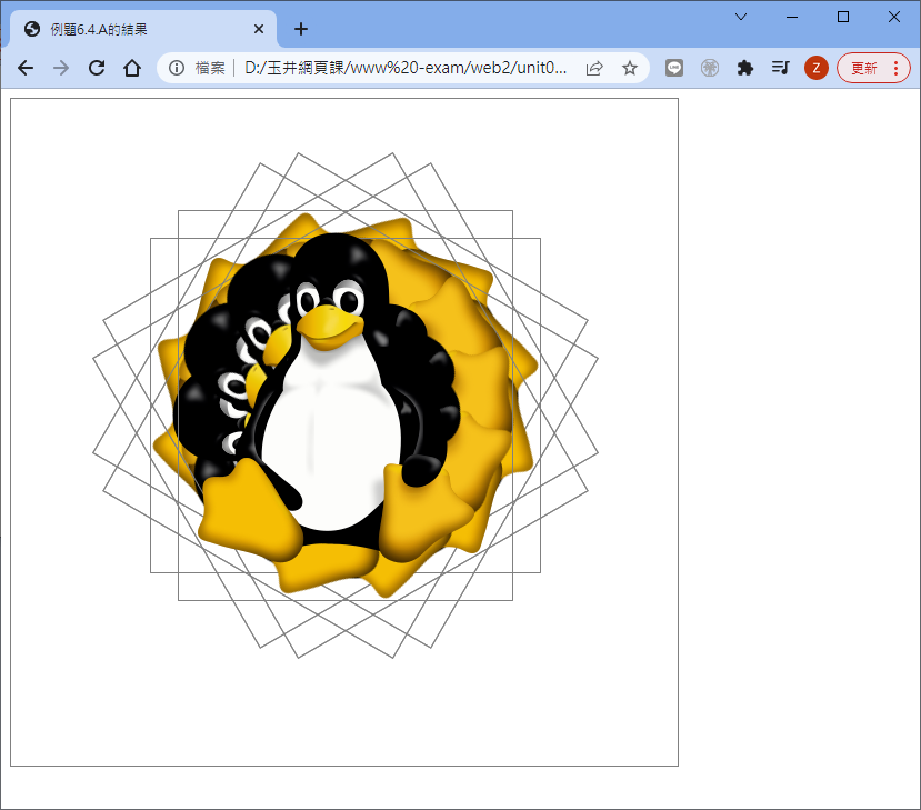所以搭配 tranform 可以完成圖形轉圈圈啊!那另外,我們可以讓背景圖示跑來跑去嘛?這當然也是可以啦!我們就用例題 6.2.A 為例來修改一下好了: