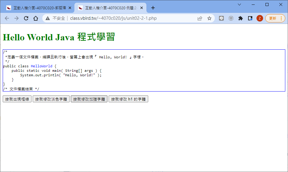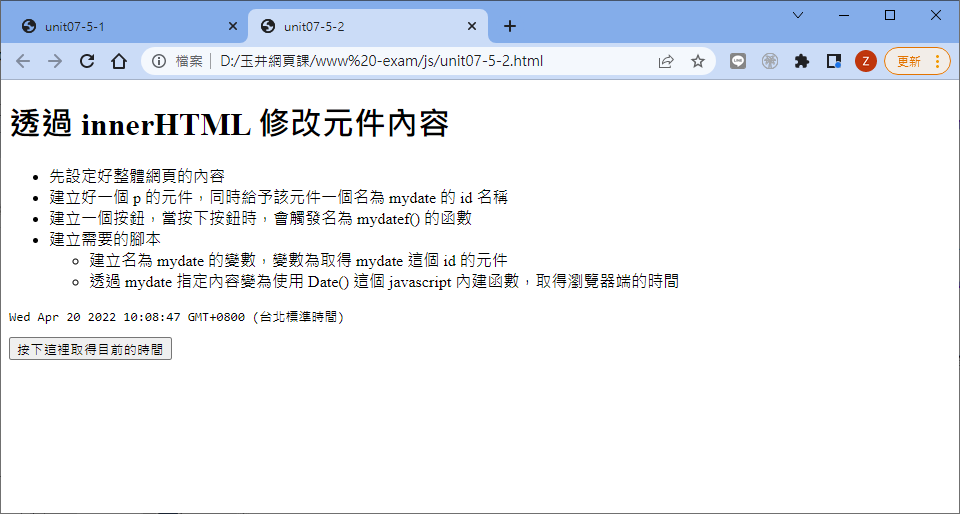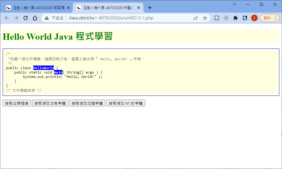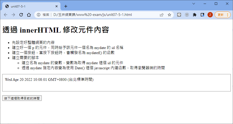 其實 javascript 在網頁上可以做非常非常多的事情,除了取得網頁元件來進行修改其 CSS 屬性之外,也可以透過 .innerHTML 或 .outerHTML 來修改元件內部資料,或者是整個元件 (含 tag 本身) 的資料喔!這個 .innerHTML 或 .outerHTML 也是得要搭配 getElement(s)By{Id,Name,TagName} 的設計。