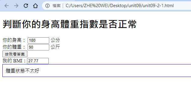 如果要同時滿足兩個以上的條件才邏輯判斷為真,那就是我們以前學數學所謂的 and 囉!如果是兩個條件的任何一個成立時,就會回傳值為真, 那就是 or 囉!例如前一章提到的 BMI 計算結果: