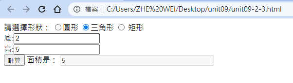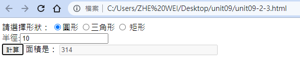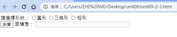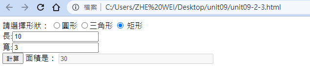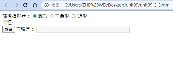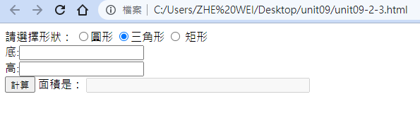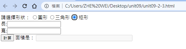 所以,我們是否能夠依據使用者點選不同的面積時,才出現所需要的 input 資訊?然後提供計算的結果呢? 似乎可以透過 if 的方式,當使用者點選相關的形狀後,再來使用 innerHTML 處理吧!設計看看: