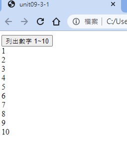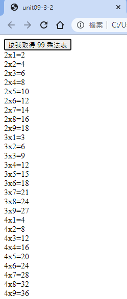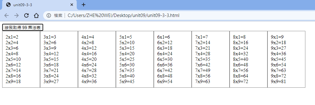 上面的案例只是將結果列出來而已~顯示的效果當然是很糟糕!如果你將每個第一層迴圈的開始與結束,都加上 div 的話,那麼就能夠隔出 8 個 div 了! 同時,將 div 加入 display: inline-block 的話,就能夠處理的比較完美!請依據這個想法,設計出 9-3-3.html 的內容。